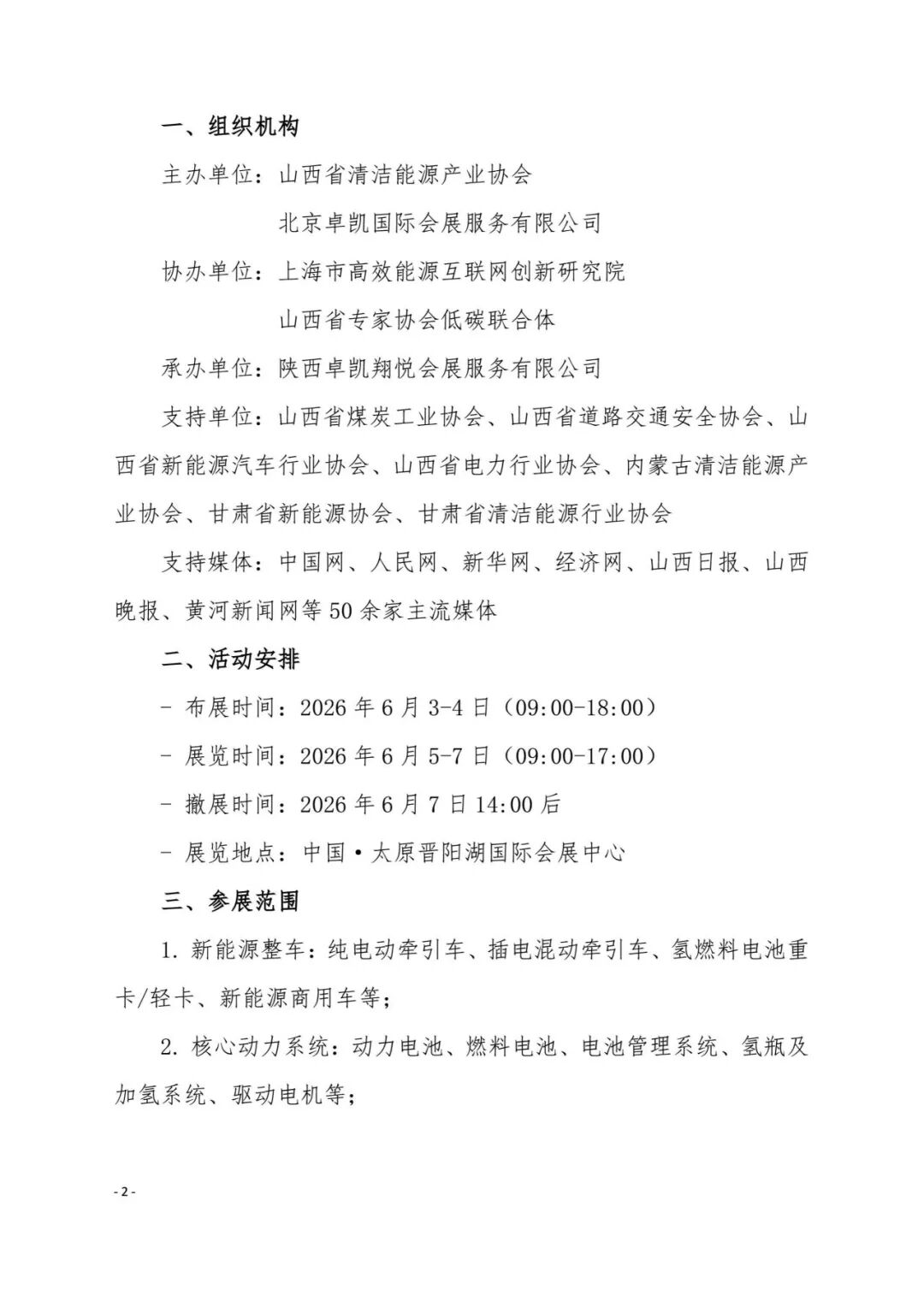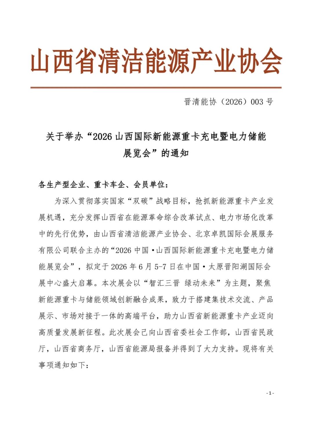 为深入贯彻落实国家“双碳”战略目标,抢抓新能源重卡产业发展机遇,充分发挥山西省在能源革命综合改革试点、电力市场化改革中的先行优势,由山西省清洁能源产业协会、北京卓凯国际会展服务有限公司联合主办的“2026中国·山西国际新能源重卡充电暨电力储能展览会”,拟定于2026年6月5-7日在中国·太原晋阳湖国际会展中心盛大启幕。本次展会以“智汇三晋 绿动未来”为主题,聚焦新能源重卡与储能领域创新融合成果,致力于搭建集技术交流、产品展示、市场对接于一体的高端平台,助力山西省新能源重卡产业迈向高质量发展新征程。此次展会已向山西省委社会工作部,山西省民政厅,山西省商务厅,山西省能源局报备并得到了大力支持。现将有关事项通知如下: